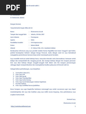 Apabila dikaji lebih dalam, pekerjaan yang tersedia di rumah sakit pun tidak melulu berputar pada pekerjaan yang bersaing di bidang kesehatan. Maka, tentu bekerja menjadi hal yang wajib bagi anda. Sebagai bahan preferensi, berikut contoh surat. Jika diminta surat lamaran kerja dalam bentuk tulis tangan saat melamar pekerjaan di rumah sakit, contoh ini bisa menjadi rujukan anda. Secara umum cara membuat surat lamaran kerja perawat tidak jauh beda dengan lamaran kerja di bidang lainnya. Hanya beda pada lampiran yang menyesuaikan tuntutan dari pihak rumah sakit. Dalam pembuatan surat lamaran kerja di pt anda harus menulis posisi yang sesuai dengan yang dibutuhkan pt tersebut. Contoh surat lamaran kerja yang ditulis tangan. Lowongan pekerjaan bagi perawat bisa tersedia dibeberapa instansi seperti rumah sakit sebelum menuju ke contoh surat lamaran kerja perawat, sebaiknya memperhatikan beberapa hal. Berikut adalah beberapa contoh surat lamaran kerja di rumah sakit berbagai posisi dan jabatan yang bisa anda pergunakan sebagai bahan referensi. Contoh surat lamaran pekerjaan di rumah sakit. Terdapat juga file.doc yang bisa anda unduh dan. Kepala rumah sakit (isi nama rumah sakitnya)(jl.
