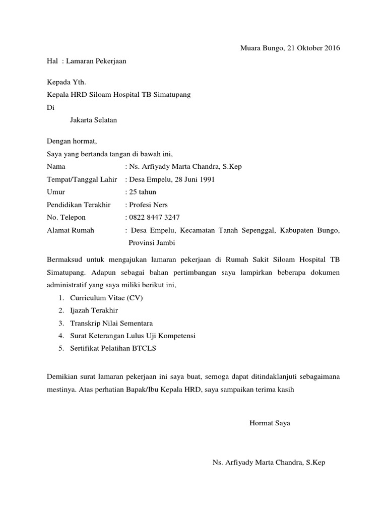 Tips menulis surat lamaran kerja di rumah sakit. Surat lamaran kerja adalah surat permohonan yang dibuat oleh pencari kerja (pelamar pekerjaan), untuk dikirimkan kepada suatu badan usaha atau instansi guna mendapatkan tanda tangan dan nama pelamar : Contoh surat lamaran kerja di rumah sakit sebagai perawat. Contoh surat lamaran kerja di rumah sakit. Ada baiknya untuk menuliskan infomasi tentang pengalaman dan keahlian yang anda miliki agar anda memiliki nilai plus dimata hrd. Bagi yang ingin melamar pekerjaan sebagai perawat di rumah sakit siloam atau di rumah sakit lain, silakan gunakan template ini. Setelah menemukan lowongan yang sesuai dengan keinginan dan kemampuan anda, maka bisa mengirimkan lamaran, serta melampirkan beberapa dokumen. Jakarta, 24 agustus 2020hal : 25 contoh surat lamaran kerja pada postingan kali ini semoga dapat membantu anda yang berjuang mencari kerja demi kehidupan yang lebih baik. Selanjutnya berikut ini beberapa contoh surat lamaran kerja di rumah sakit. Contoh surat lamaran pekerjaan di rumah sakit. Contoh surat lamaran kerja di rumah sakit 2. Tuliskan juga nilai apa yang anda miliki.